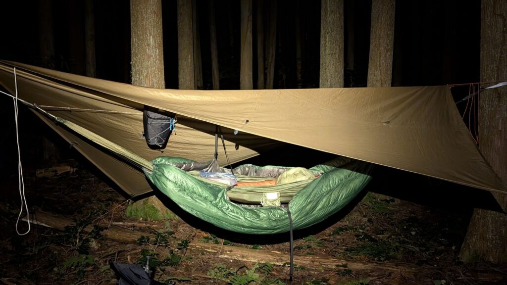 - ハンモックをアンダーキルト、自立膨張式マットを掛け布団のようにして気温3度前後でも寝ることができた。ただしあまり快適ではなく、より寒い時期にはトップキルトの必要性を実感した