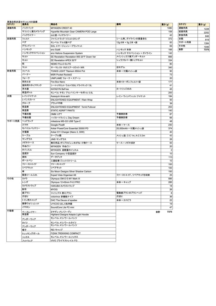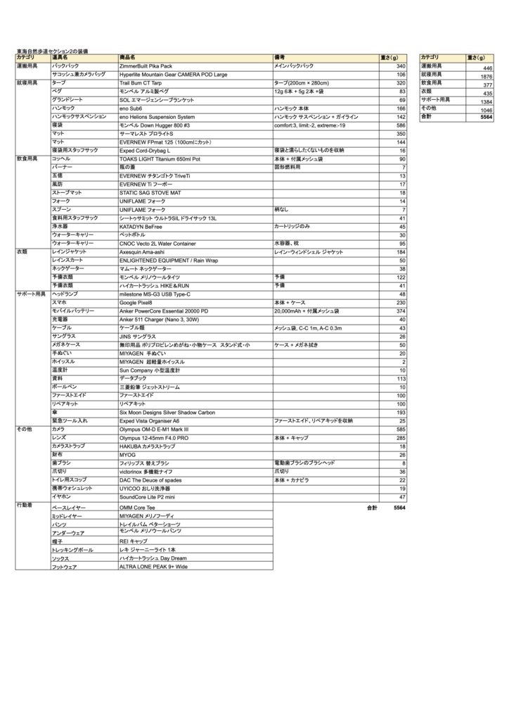そのため、軽量化を最優先に装備を見直し、バックパックや調理器具などを中心に構成を変更しています。