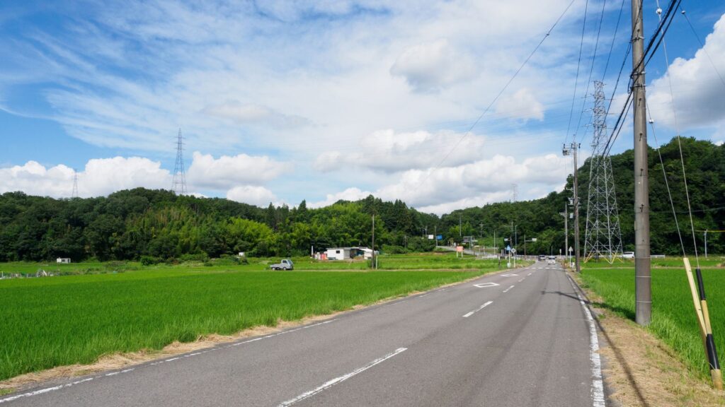 - たくさん実った稲穂を眺めながら進む田園地帯