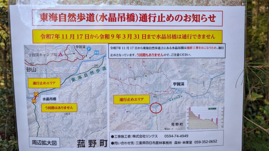 東海自然歩道は1,000km以上続く長いトレイルのため、すべての区間を常に整備するのは難しく、自然災害などで通行止めになっている場所もあります。